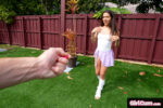 Amira Mae, sexy brunette Latina teen with braces and tattoos, starts teasing legs spread on couch in white tank and leg warmers, then moves to backseat car makeout where she's topless, skirt hiked, Johnny Love gropes her wet pussy, pulls thong aside to spread labia. She strokes and sucks his thick cock deepthroat style. Outdoors on grass, she plays with pink remote vibrator on her clit and wet pussy. Back inside, nude Amira takes doggy style pounding on couch, tight ass gripped, prone bone with legs spread, cowgirl riding his dick reverse with pubic hair visible, missionary legs up. Finishes with sloppy blowjob, face blasted in huge facial cumshot dripping down her slim body and white socks.