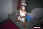Liora Vane teases on the couch in her white cat-print crop top and mini skirt, flashing her small tits and spreading her legs to reveal her …